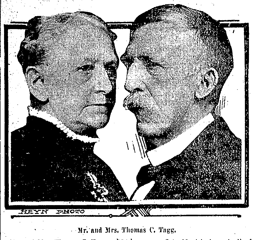 | Bio Article* | Celebrate Golden Wedding 50th Anniversary Photo Mr. and Mrs. Thomas C Tagg, who resides at 5343 North Twenty-fifth avenue, will celebrate their fiftieth wedding anniversary on Tuesday. A reception will be given that evening in their honor at the home of their son, Mr. W.B. Tagg, and Mrs. Tagg, at 3715 South Twenty-fifth street. The hours are 8 to 10 o'clock, and all of the friends of Mr. and Mrs. Tagg, have been invited to call during those hours. Mr. Tagg was born at Granthem [sic], England, while Mrs. Tagg, whose maiden name was Miss Mary Bodine, was born at Port Richmond, Staten Island. He first met his bride-to-be in Kentucky, where he was serving as a soldier in the Union army, and was she was teaching school. When the war was over they were married at Lee Center, Ill, and moved to Nebraska in the spring of 1871, settling on a farm in York county. They resided there until 1877 when they moved to Waco, Neb., living there until 1908, when they moved to their present location in Omaha. They came to Nebraska in the early day when the Burlington railroad only ran as far as Seward; and they made the trip from there west to their claim in York county in a covered wagon. In the early days Mr. Tagg bought grain and hauled it to Seward, and later when the railroad built west, he moved his business to Waco, and there bought grain and live stock for several years. At one time he ran a hardware, implement and general store. They have three children living, all of whom will be at the celebration. Mrs. D.D. Ashley, whose home as been for several years in New York city, is here on a visit and will remain for the event. The other two children are Mr. A.W. and Mr. W.B. Tagg, who are engaged in business at the stock yards, and have resided on the south side for many years. One other son, Harry Tagg, who passed away six years ago, will be represented by his son, Harold E. Tagg and the latter's son Harold E. Tagg, Jr., the only great grandchild of Mr. and Mrs. Tagg and another son, Lowell Tagg. The family of Dr. and Mrs. Ashley includes three children, Homer C. Ashley, Dexter D. Ashley, Jr. and Helen C. Ashley, while the family and Mr. and Mrs. W.B. Tagg includes Richard F. Tagg, William L. Tagg and Mary Elizabeth Tagg. Sunday World Herald, Omaha, Nebraska, 6 Feb 1916; Principal=Thomas Coultas Tagg13 |