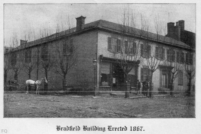 About ten years later, in 1866, the old building was again torn up to make way for new improvements; a a second addition of another twenty feet was added, the floor was lowered to the level of street and the front was changed, but the dwelling was left undisturbed. During theses alterations, which were not finished until the spring of 1867, the firm occupied the room just across Chestnut Street, the H.T. Barnes corner. The very next year marked another change in the history of the firm. John Bradfield took his eldest son, Thomas Shannon, into partnership and the firm became J. Bradfield & Son, under this double management the store prospered rapidly.