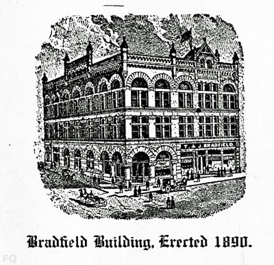Mr. John Bradfield died in 1893, but he left the invaluable heritage of his business methods and foresight to his sons, along with his name, which is indelibly associated with that corner of Chestnut and Main Streets now occupied by the Bradfield Block.