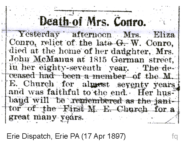 Obituary Mrs. Eliza Conro, Erie Dispatch, Erie, Erie Co. PA, 17 Apr 1897