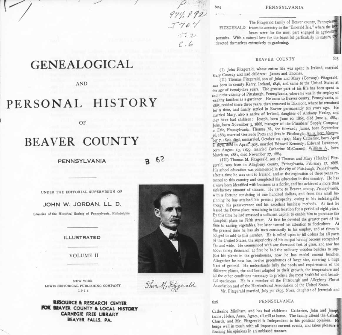 Fitzgerald, Genealogical and Personal History of Beaver County Pennsylvania, under the editorial supervision of John W. Jordan, LL. D. Volume II, Lewis Historical Publishing Company 1914, New York (source: Carnegie Free Library, Beaver Pennsylvania)