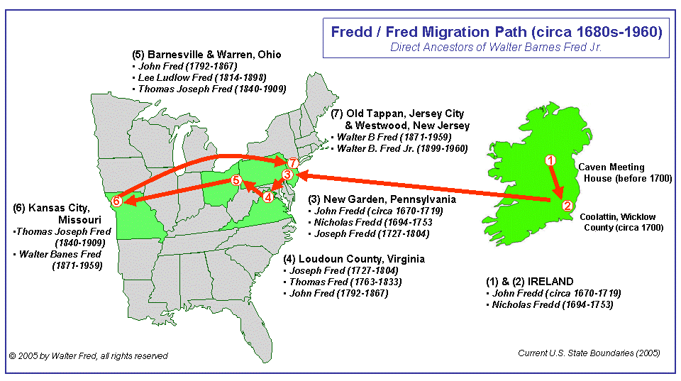 Fred/Fredd Migration Path (ca 1680s-1960), Ancestors of Walter Barnes Fred