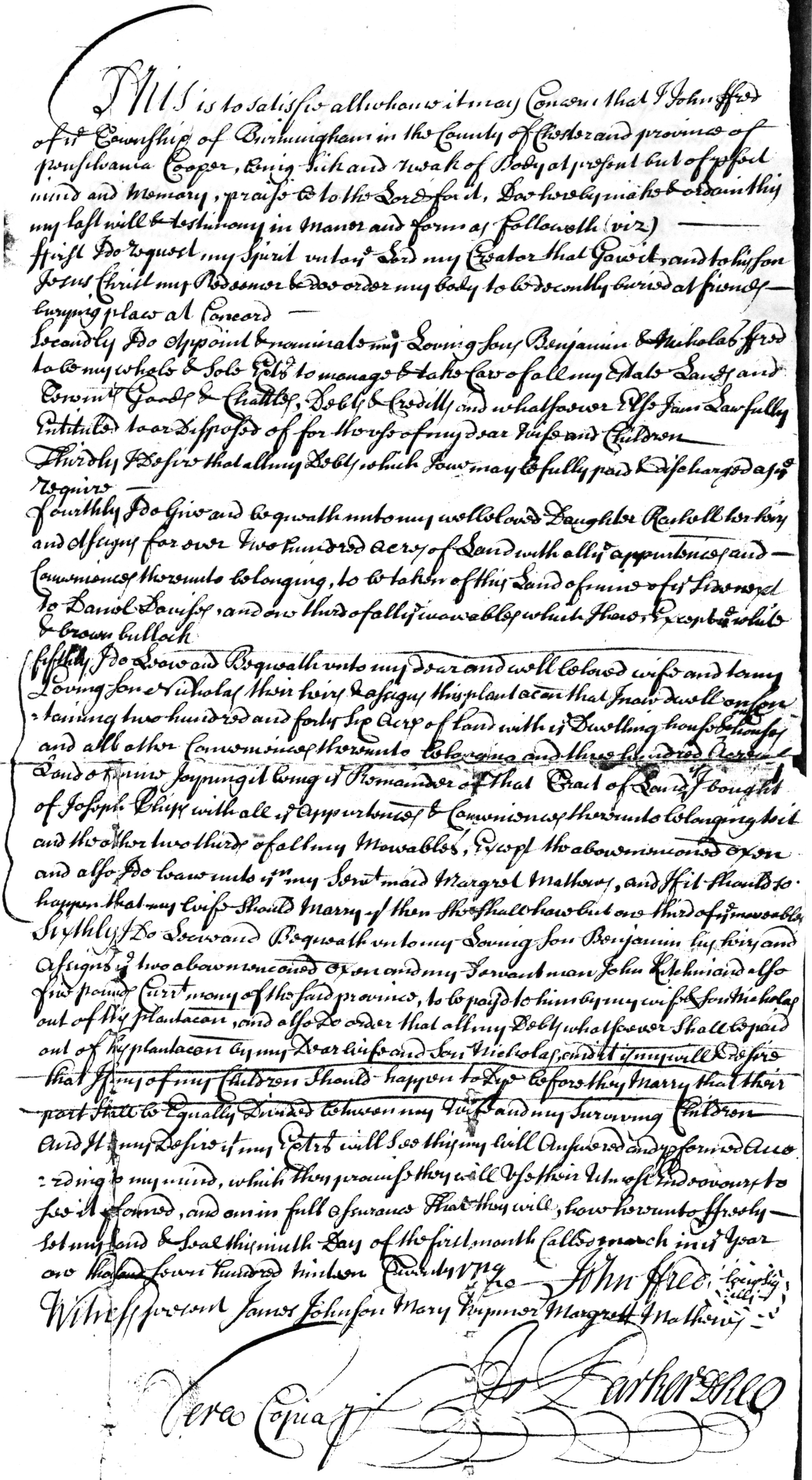 John Fredd's Last Will & Testament, 1719-20 (Chester County Historical Society)
