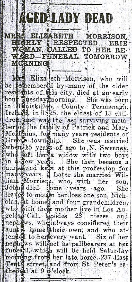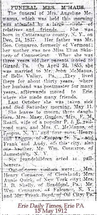 Patrick McManus and family settled on a farm in Green Township, Erie County, Pennsylvania whose fields had just been cleared . The first to pioneer in this area were German immigrants, then came the Irish to carve out homes for their families. Patrick & Mary had a total of thirteen children of which only eight appeared to reach adulthood. The oldest child, Elizabeth (1824-1909) married Nicholas Sweeney and was left a widow with two children, she later married William Morrison; Margaret (ca 1829-1887) who married William Sheldon and moved to Kane then Bradford, Pennsylvania; John (1832-1897), who married Angeline Connaroe and became a wheelwright in Erie City and eventually the Postmaster in nearby Belle Valley; Anna (1835-   ), who married John Boyd; Thomas (ca 1839-   ); Katherine (ca 1841-1897), who married an Bernard O'Gorman and moved to the New York City area, Mary Jane (1842-1877) who married William McCullough and died tragically in a house fire;  and Matilda (ca 1850-bef 1860) of who little is known. They were a large and active family many of which were involved in railroad operations and skilled carpenters.  Three of John's children were involved in the construction of Saint Alphonsus Monastery in Esopus, New York.  His son, Eugene went on to become the Building Inspector for the city of Erie, Pennsylvania.