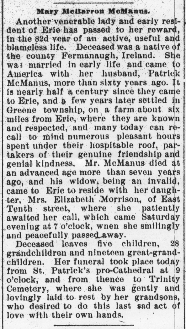 Patrick (1799-1882) & Mary McBarron McManus (ca 1808-1890) immigrated from Enniskillen, County Fermanagh, Ireland shortly after 1825 and came to United States with their oldest child Elizabeth. They appeared to migrate across Pennsylvania with the expansion of the Pennsylvania Canal. Their son John was born in 1832 in Hollidaysburg, Pennsylvania which at the time was the western terminus of the Pennsylvania Canal and the eastern end of the Portage Railroad under construction. Its also possible they previously lived along the canal in Alexandria, Pennsylvania where a Historic American Building Survey lists the "Patrick McManus House" being built circa 1829 and deed records show Patrick selling the house in 1830.  In 1840, Patrick McManus is living in Sadsbury Township (on Conneaut Lake) and at the crossroads of the Beaver-Erie Canal and the French Creek Feeder line.  The canal system had made its way to Erie in 1844 where the McManus family can be seen in 1850 and subsequent census enumerations.