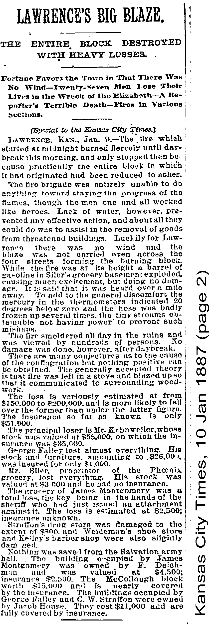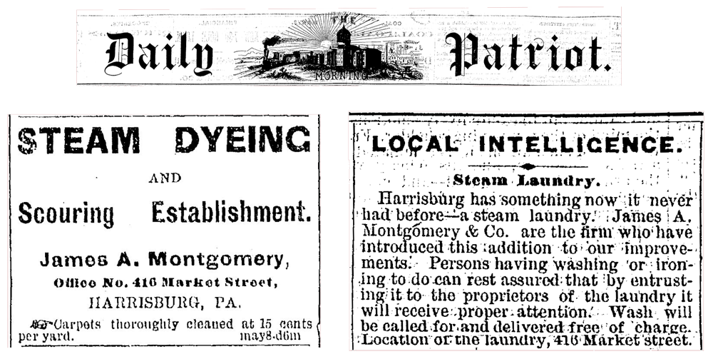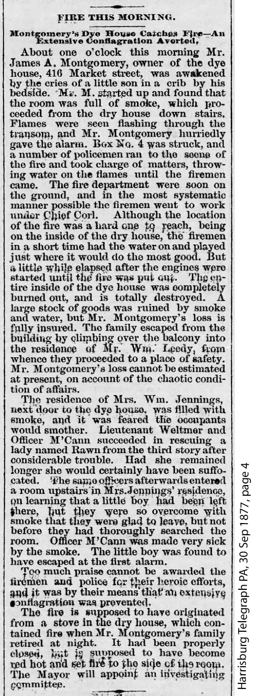 James Montgomery spent several years in Harrisburg running a "Steam Dyeing and Scouring Establishment" and during this time was a Sergeant in the Harrisburg Gray Guards (Harrisburg City Militia).  James & Laura Montgomery's first three children were born during their time in Harrisburg (Nellie Rose (1873-1933), Martha Egle (1875-1875) & Harry Sturgeon (1876-1965)).  The family lived above the "Dye House" at 416 Market Street.  Early on the morning of 30 Sep 1877, their son Harry woke the family when he began crying from the crib.  This warning cry alerted the family to a spreading fire below in time for them to escape by climbing over the balcony to the building next door.  The early warning allowed the police & firemen to respond in time to put out the fire and rescue those in surrounding area without any loss of life [newspaper clipping]. It was short after this that the family moved west to Kansas.  In 1878, James and "John A. Eberly of Mechanicsburg", PA had "entered into partnership at Lawrence, Kansas, in the general produce and commission business."  Conflicting evidence has their last fourth & sixth children (Flora May (1878-1943) & Laurence A. (1886-   )) born either in Harrisburg or Lawrence, Kansas where the family was captured in the 1880 Census running a grocery store.  Their fifth child (James Blair (1880-1881)) was born, died and was buried in Lawrence, Kansas.  The Grocery Store destroyed in the Fire of 1887 that destroyed the entire block [newspaper clipping].  James Montgomery and family moved to Kansas City, Missouri with James working for the Water Department.