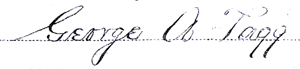 Alfred Ringrose Tagg (1849-1933) was born in Charleston, Charleston Co., South Carolina within months before his family made the trek out to Wisconsin. In 1870, the twenty-two year old Alfred is working as a farm laborer in Bradford Township, Lee Co., Illinois. His brothers, Thomas, George and Herbert were nearby farming as well. In 1874 Alfred Ringrose Tagg married Harriet Caroline Barker (1849-1915) in Lee Center. After their marriage, the newly married couple moved to Chicago. In 1879, Alfred and his brother Edwin C. Tagg started the "Tagg Brothers Shirt Company" focused on made-to-measure shirts which they sold in their own retail store. The fledgling business was to become a successful one selling merchandise in over thirty-seven states. But in 1880 Alfred and his family, which now included Carolyn Emma Tagg (1875-1968) and Oliver Milton Tagg (1877-1902), were living with his mother-in-law Caroline L.Barker (ca 1804- ). Alfred and Harriet's were to have three more children, Florence May Tagg (1881-1884), Alfred Russell Tagg (1884-1967) and Harriet Grace Tagg (1889-1966). Sometime in the 1890s, Alfred turned the reigns of the company over to his brothers and moved to San Bernardino, San Bernardino Co., California where he became a "dairyman." Harriet passed away in 1915 and Alfred moved to Los Angeles County. He passed away in 1933 in South Pasadena.