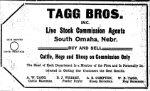 Arthur Willard Tagg (1870-1955) married Sarah circa 1896. Arthur, along with his two brothers Harry and William started the "Tagg Brothers Live Stock Commission" at the Union Stock Yards in Omaha. The Tagg Brothers were prominent in the live stock business and in the Omaha community. They were even a party in a U.S. Supreme Court decision on the U.S. government's authority to set allowable live stock trading commissions (Tagg Bros. & Moorhead v. U. S., 280 U.S. 420 (1930)).